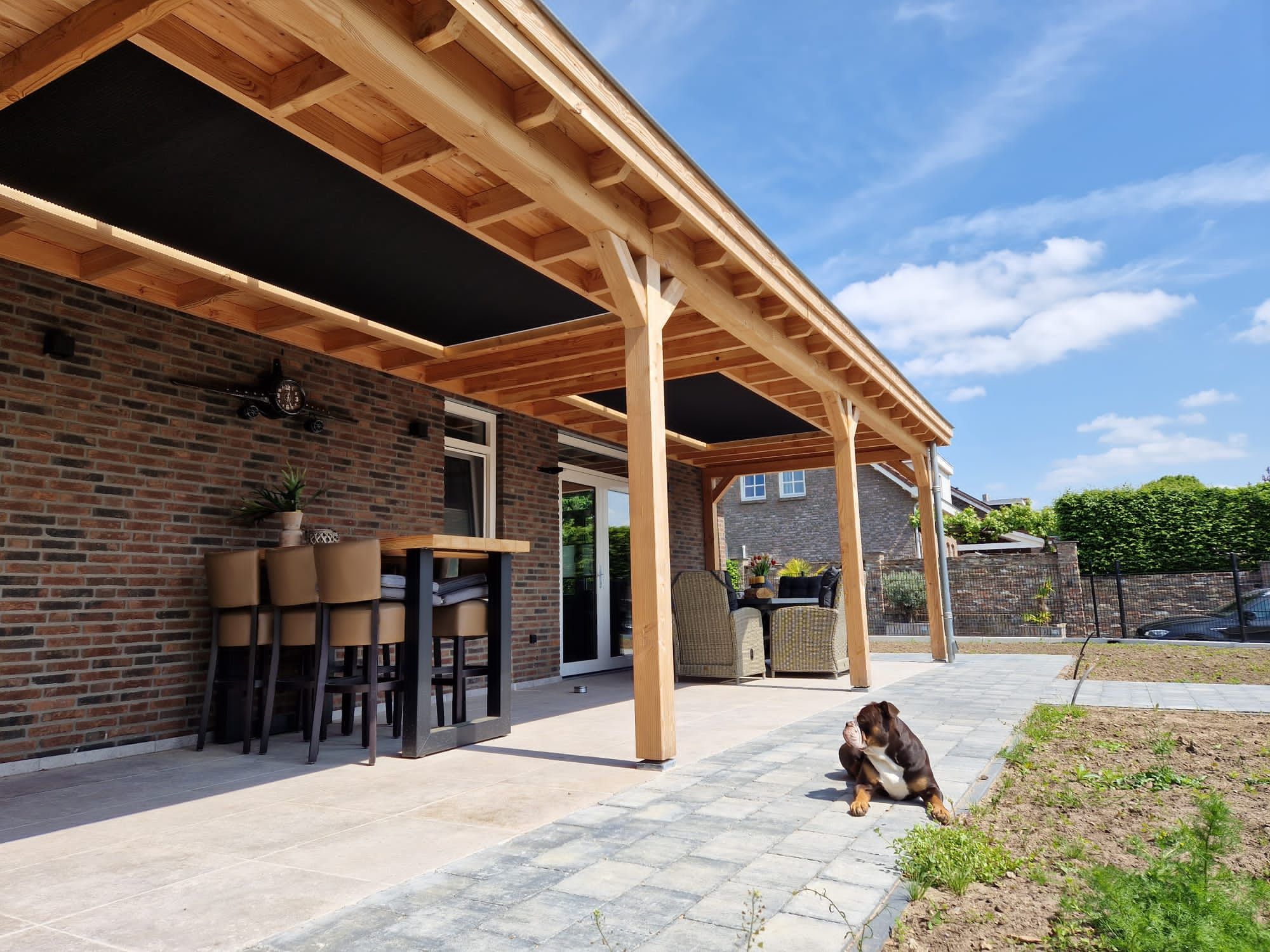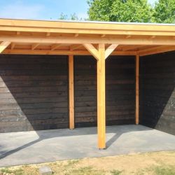 Es ist auch möglich, ein freistehendes Holzdach auf der Rückseite Ihres Gartens zu installieren. Mit einer zusätzlichen Falzwand aus Holz/Aluminium oder einer Glasschiebewand können Sie zum Beispiel windgeschützt sitzen und den Außenbereich noch länger genießen.